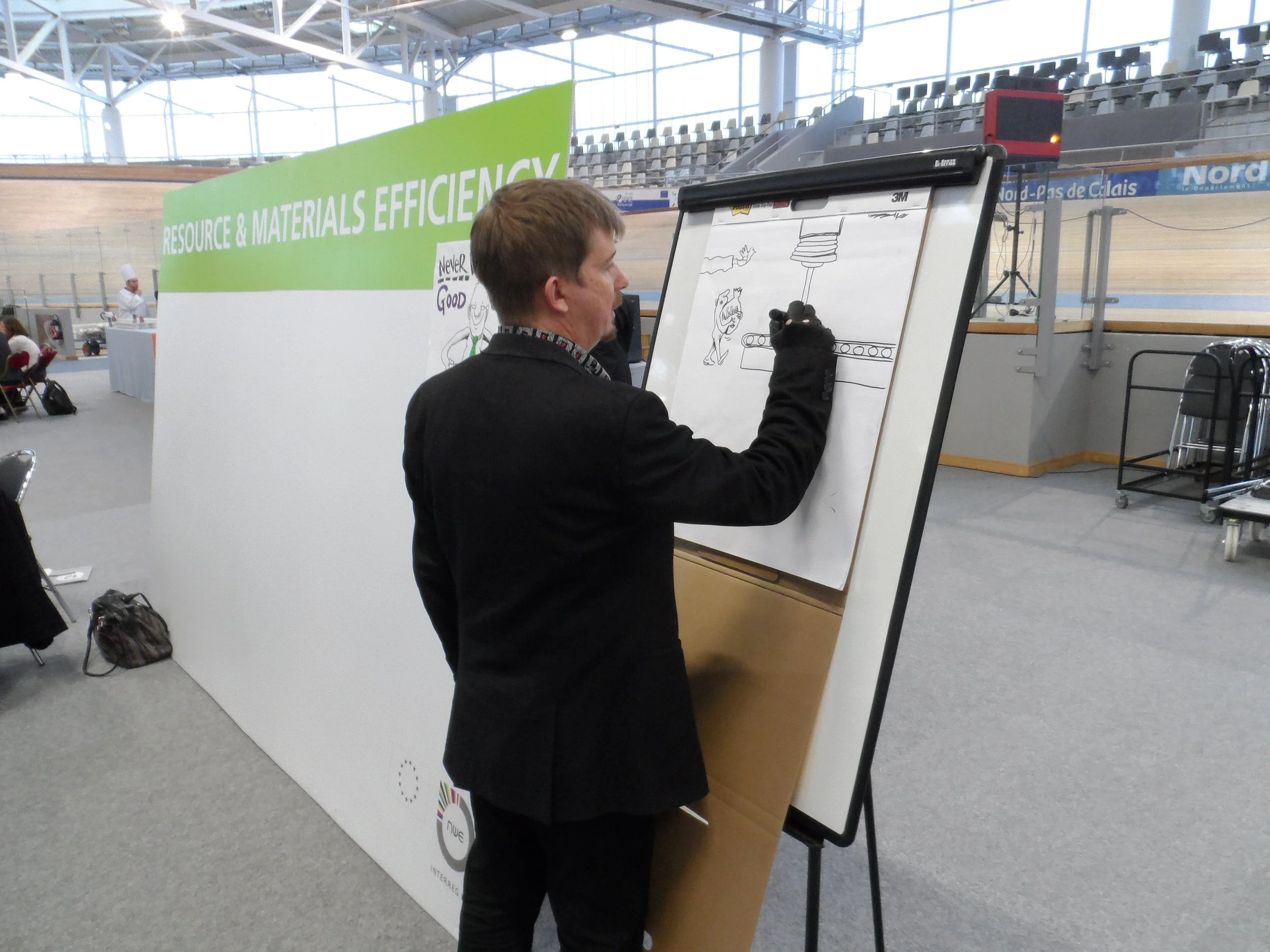 This reminded me of some of the more unusual venues we’ve drawn at over the years, and going a way back to one of our early gigs, at the Stab Vélodrome in Roubaix in northern France for Interreg. Drawing whilst cyclists whipped around us at great speed made for an unusual experience.
